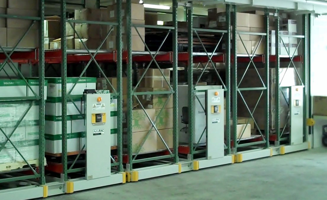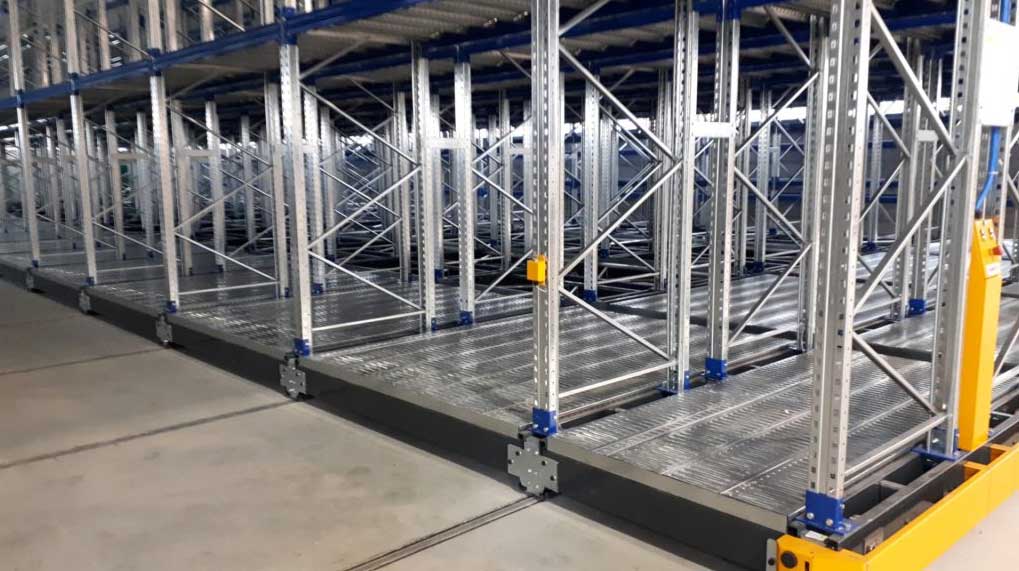 This system uses floor shelving or racks for pallets, arranged on a mobile base at manual or mechanical translation. This makes possible to eliminate the access corridors and, at the right moment, only the requested working aisle is opened, thus assuring the direct access to every pallet.